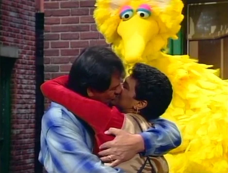 SCENE 2 | Big Bird wants to educate the Birdketeers on what "love" is. He asks Maria and Luis to kiss, but the two say they're still busy. They relent and Maria gives Luis a peck on the cheek. "You call that a kiss? I give my teddy bear Radar better kisses than that," says Big Bird unimpressed, so the couple shares a much more passionate one. "Now that's love!" declares Big Bird. |