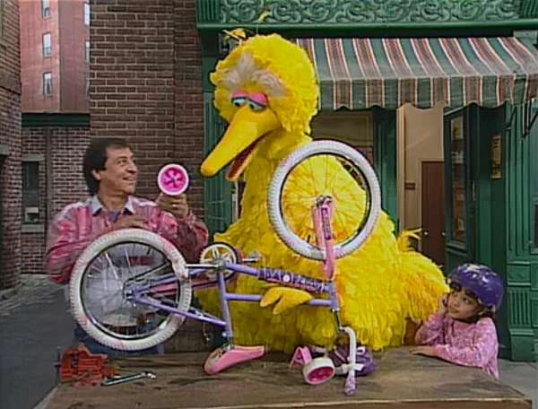 SCENE 1 | Big Bird brings Gabi to the Fix-It Shop, feeling very excited to see her training wheels removed. Luis puts the bike up on the work table and Big Bird expresses interest in helping. Since there's only so much he can do, Big Bird offers to count the wheels (to make sure the right amount are removed). He's able to get one off, but the other appears to be stuck (much to Gabi's pleasure). |