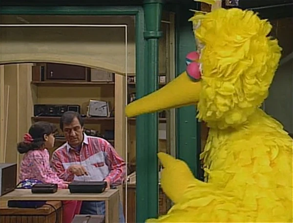 SCENE 5 | Big Bird explains what's happened so far and watches Gabi and Luis talk inside the Fix-It Shop. |