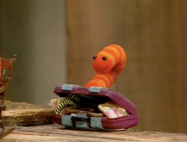 SCENE 2 | Maria and Luis help Oscar pack Eartha's overnight suitcase, reading from a list that her worm birthing book suggests will help. They load in several essential worm-sized items such as a robe, address book (should she need a lawyer), diapers, a bonnet, and a bungee cord. Maria makes the suggestion of a picture of a loved one, having gone through the experience when having Gabi, so Oscar produces a small photo of Slimey. They have trouble closing the full suitcase until Slimey gives a mighty jump on top of it. |