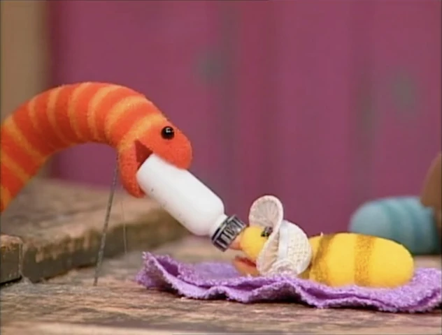 SCENE 6 | A few kids watch as Slimey helps feed his new sister before the family heads to the hospital. Oscar reveals that the baby is named Sloppy after the car she was born in. Another wormgram arrives which Maria reads: it lists the sponsors. |