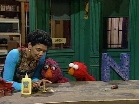 SCENE 4 | Maria repairs Telly's triangle with glue, though he worries it won't be mendable (thinking it might come back as a square). Maria shows him how well she put it back together, but Telly has a hard time waiting for the glue to dry. Elmo proposes they pass the time by counting and they all count to 40 together, with the N chiming in for 9, 19, 29, and 39. With the triangle repaired, Telly lets Elmo hold it. |