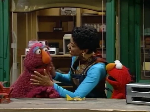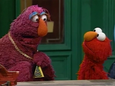 SCENE 3 | Telly comes by the Fix-It Shop to show off his favorite triangle, which he wears like a necklace. He allows Elmo to hold it, but it drops on the sidewalk and shatters. They both blame each other for breaking it, but Maria calms them down and talks with each of them, explaining it was nobody's fault and it simply was an accident. Elmo and Telly make up, and the N joins them for a hug. |