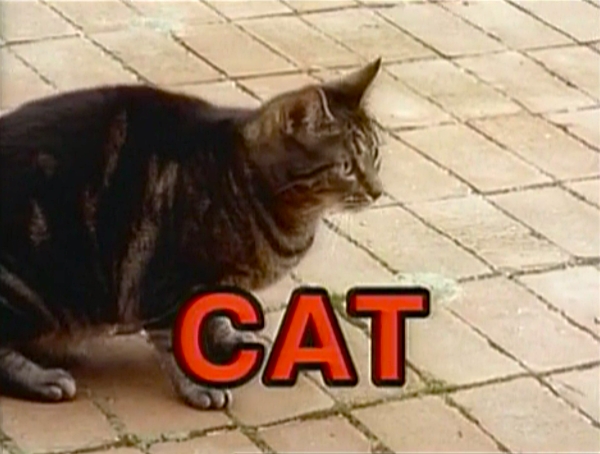 Animation | The word CAT is shown, followed by a black cat sitting on a chair. (First: Episode 3000) |