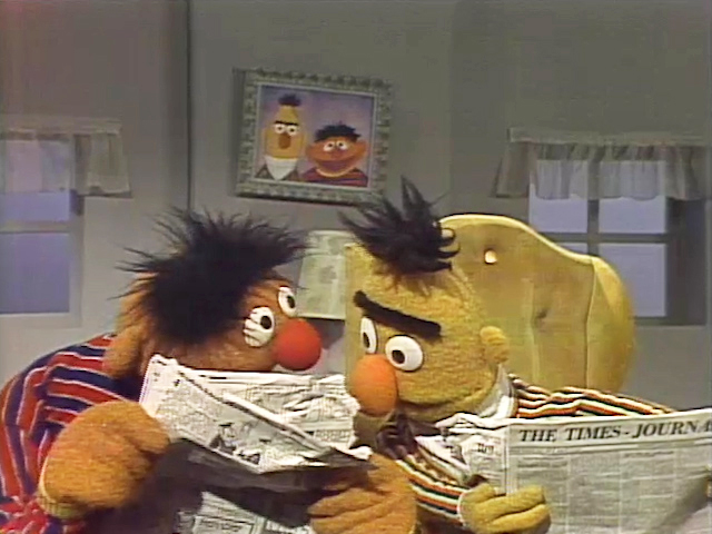 Muppets | Ernie and Bert: Sharing a Newspaper — Ernie reads the newspaper over Bert's shoulder. (First: Episode 1193) |