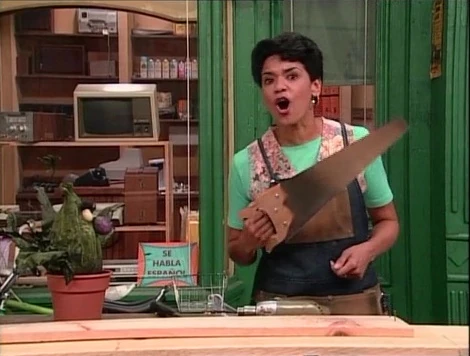SCENE 2 | "Stinky Rodriguez" has been replanted at the Fix-It Shop, where he refers to Maria as "Mom." The others go about their business, but Stinky groans in agony when Maria starts working, getting a major headache when she uses her hammer, saw, and electric drill. Benny confirms his suspicions when he and Telly return, even though Stinky claims it's no big deal: "That's what she does for a living. What else can I do but live with the pain in my head?" Telly thinks they can get him a new family, and tries to get Gina's attention when she passes by. |
