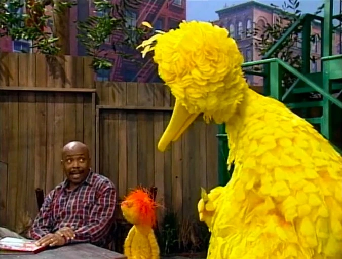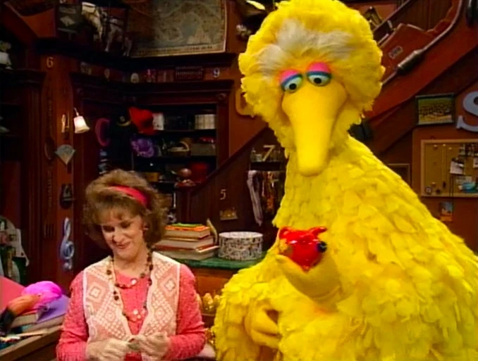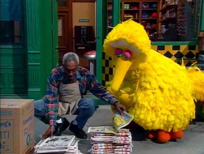 SCENE 1 | Big Bird stops by Hooper's Store and finds a busy Mr. Handford preparing a few items before the store opens. Big Bird offers to help out, so Mr. Handford teaches him how to assemble and stack newspapers while he takes care of the cereal supply. |