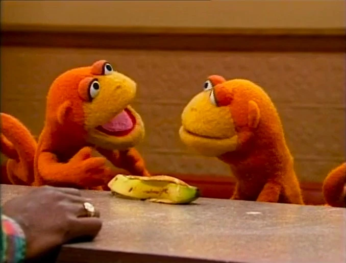 SCENE 4 | Joey and Davey Monkey have learned about Big Bird's wealth, and think he should buy them a banana with his dollar (they only cost 10 cents). Trying to figure out a good reason for Big Bird to buy the banana, the monkeys agree to work for it by helping Big Bird figure out what else to buy. |