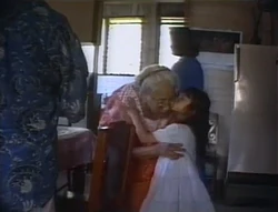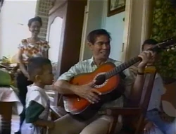 SCENE 5 | Angela loads the next tape, where Lexine's family all gathers for a big party. They greet each other with a hand gesture called a mano, and footage of the kids playing is intercut with the grown-ups preparing the food. They are later seen using banana leaves as a tablecloth and banana tree stalks as plates. Lexine's grandfather is also seen playing a guitar as she and her mother sing a song in Tagalog about picking fruit, making everyone hungry again... |