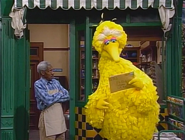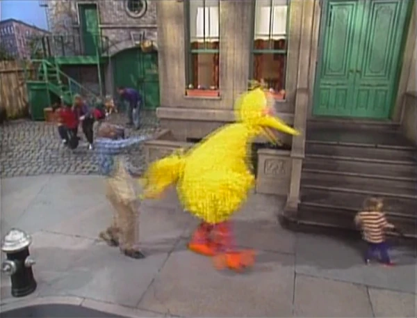 SCENE 1 cont'd | Big Bird finishes the letter, which turns out to be a self-portrait made by Roadrunner; Big Bird just imagined the words. He also imagines what it would be like to be as fast as a road runner, picturing himself, then the entire street in fast-motion (using the score from the "Road Runner" film). He then imagines having a birdseed milkshake, which Mr. Handford can make a reality. |