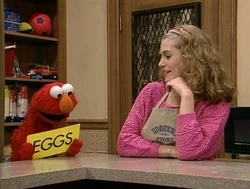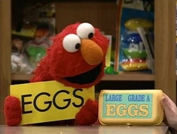 SCENE 4 | At Hooper's Store Elmo asks Gina to help him read his last word. She turns it into a game and gives him some clues to guess: it's something for breakfast that comes from a chicken (which she does an impression of). Elmo realizes his word says EGGS, which Gina confirms with a carton of eggs. |