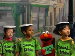 SCENE 3 | Elmo crashes Oscar's Grouchketeer meeting so he can help him read his next word, but naturally Oscar refuses to. Elmo instead decides to join in the group's dance for now, which is called "The No-No-No!" |