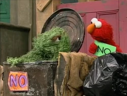 SCENE 3 cont'd | Elmo realizes that his NO sign is the same as the sign on Oscar's trash can and reveals that Oscar and the Grouchketeers helped him after all, much to Oscar's chagrin. |
