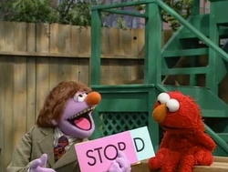SCENE 1 | Elmo informs Tarah about Sonny's game show and asks her to help him read the word STOP, but he thinks she's telling him to stop. She explains what she means and Elmo thanks her with a kiss before going to get the next word. |