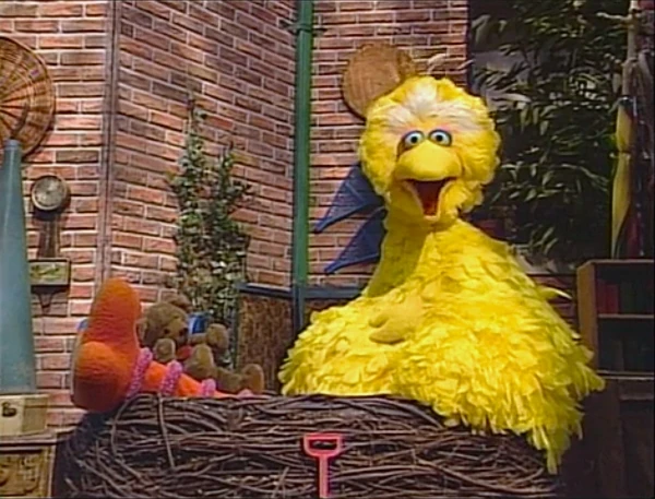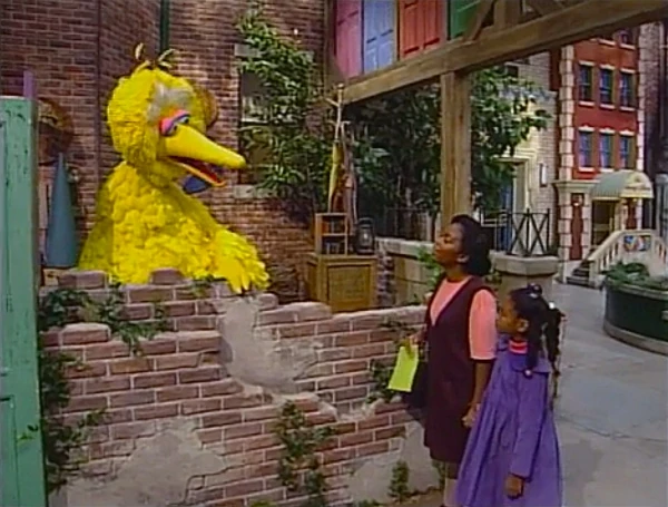 SCENE 5 | Arlana and her mother pass by Big Bird's nest and ask him for directions to the Fix-It Shop. He points them toward it and learns that they're the dog owners. He soon has an emotional conflict over whether the situation makes him happy or sad. |