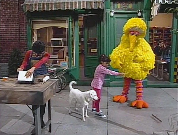 SCENE 2 | Gabi and Big Bird play with the dog near the Fix-It Shop, as Big Bird reports no one has called yet. They think they should name the dog, but Maria votes against it; he already has a name his original owner gave him. Just then, she gets a call from an Anything Muppet man (Peter Linz) who's heard of their flyers through the grapevine. He claims his pet is furry, cute, and named Freddie, who doesn't come when called. The dog seems to fit that description, so he heads over to the Fix-It Shop. |