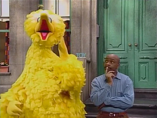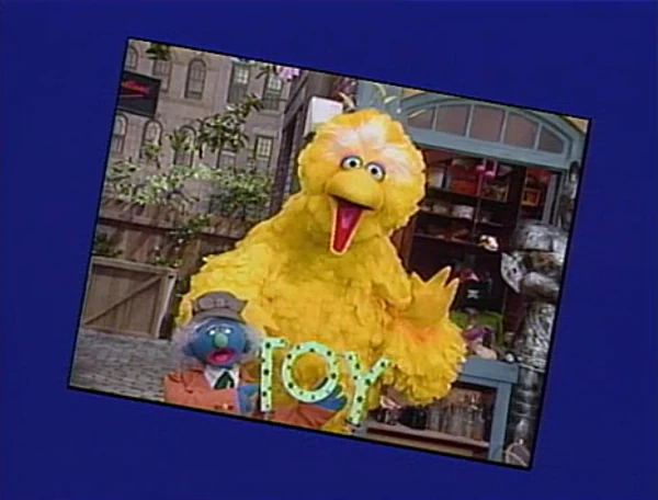 SCENE 1 | Big Bird and Gordon welcome the viewer, but are instantly hushed by an Anything Muppet woman who tells them they'll scare the word away. She turns their direction behind them and they spot the word TOY atop the stoop. She takes its picture and introduces herself as President of the Wordabaun Word-Watching Society. She's hoping to find the rare and elusive Green-Spotted-Hopping TOY and shows them its picture in her guidebook, as well as demonstrates its trademark call ("Toy-toyeeeeee! Toy-toyeeeeee!"). She has yet to see one, but has heard through the "word-vine" that it is somewhere on Sesame Street. Big Bird offers some help and they both go off, making the TOY's call. |