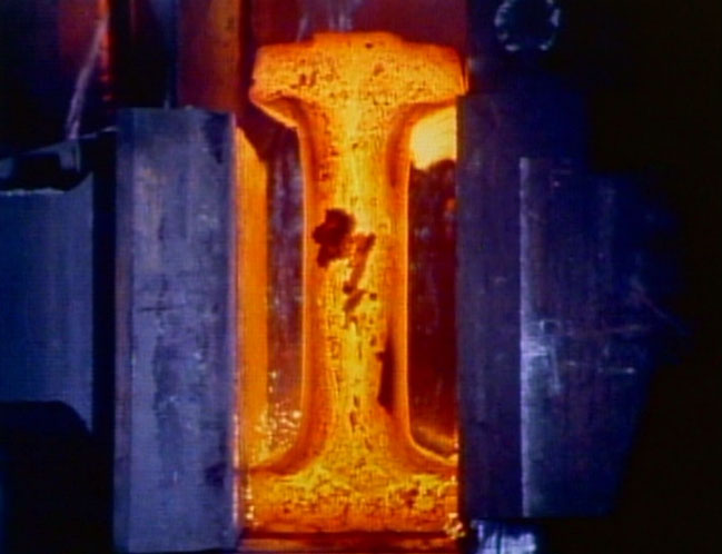 Film | An I-beam is molded at a steel factory as heavy industrial-type music underscores the action. The segment ends on a video freeze of the finished beam, which is shaped like the letter "I." (First: Episode 1077) |