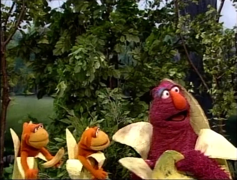SCENE 3 | Now, the gang plays "Cowboys and Bananas." Big Bird and Rosita dress as cowpokes while Telly, Davey, and Joey don banana outfits. The game starts with a round of "One of These Things," using the three faux-bananas and a real one. Since the real banana doesn't belong, the monkeys gobble it up. The next part is the banana round-up, where the cowboys must catch the bananas as they run around. |