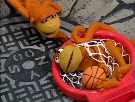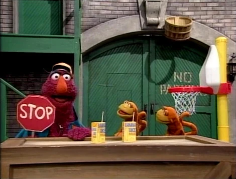 SCENE 3 | Telly blares his whistle at Joey and Davey Monkey while they play basketball in the yard. He accuses them of littering their banana juice boxes on a nearby crate, but the monkeys inform him they'll be throwing the boxes out when they're done. Telly continues on his environmental quest and Davey makes a powerful "monkey dunk" that shatters the backboard (and his back). |