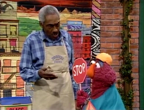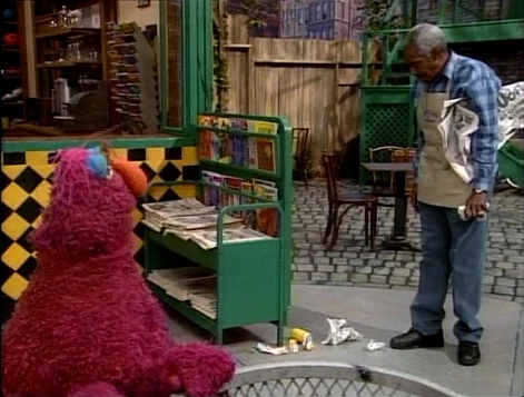 SCENE 1 | Telly tries to welcome the viewer when he hears Mr. Handford complaining about litter outside Hooper's Store. He throws it into a nearby can and wishes there was a way to prevent people from making more litter, and Telly rushes off inspired. |