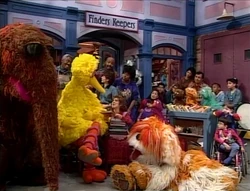 SCENE 6 | The group, now joined by Telly, Baby Bear, Zoe, and Rosita, has gathered at Finders Keepers and listen as Ruthie finishes reading Goldilocks and the Three Bears. Big Bird still remains inflicted by the memory flu, but he does recall having fun playing tag with Snuffy earlier and starts another game with him. "At least Big Bird's having fun," a crestfallen Ruthie says. |