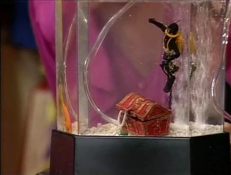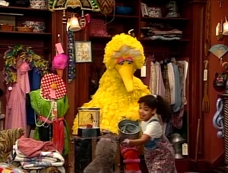 SCENE 1 | Maria drops off Gabi and Big Bird at Finders Keepers, where Ruthie will look after them while she runs some errands. Ruthie plays a guessing game with the two as she sets up a fish tank, pouring in gravel, adding a miniature scuba diver, and plugging in the air filter. It turns out to be the home of her new goldfish, Jacques Cousteau. |