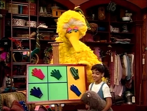 SCENE 3 | To take Wolfgang's mind off fish, Big Bird has set up a musical game for him: "Here Are Some Things" using gloves and a mitten. The game works, but Big Bird lets the word "fish" slip and sets Wolfgang off again. |