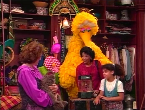SCENE 4 | The three decide to cover up Wolfgang's eyes so he can't see the fish, but he can still smell it. They then plug his nose, then his ears when he hears the word "fish" again. However, now Wolfgang becomes disoriented and crashes into everything due to his coverings. Ruthie removes them and Big Bird gets a great idea, carrying Wolfgang out of the store. |