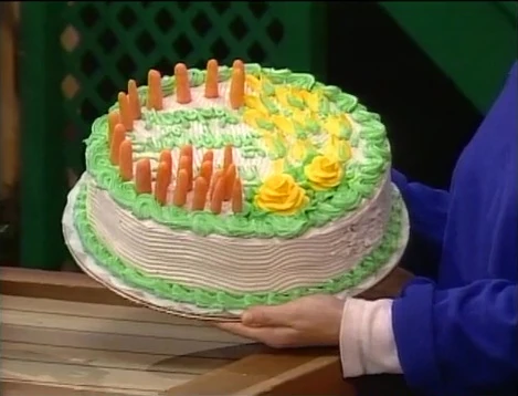 SCENE 6 | Benny notices Stinky, Gina, Big Bird, and the kids gathered in the yard when his watch beeps, which means he has to get back to the hotel. He wonders out loud if there is a surprise waiting to happen. Gina does have something to say, and Benny thinks he beat her to it, but instead she announces the sponsors as the closing theme music plays. Benny suddenly feels sad that it's time to say goodbye when Gina and the rest of them yell out "SURPRISE!" Benny acts like he knew all along that they were going to surprise him, but he becomes enticed by the 24-carrot cake Gina presents. |