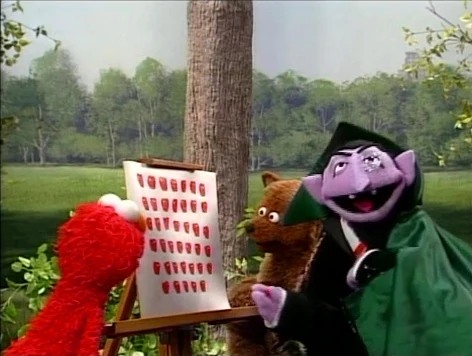 SCENE 4 | The Count tells Baby Bear and Elmo to stand back as he counts the 40 apples that he has just drawn with Baby Bear's crayon. After the Count leaves for a snack, Baby Bear realizes his red crayon is now too short to draw Elmo! Elmo remains stiff as Baby Bear runs off to get another red crayon. |