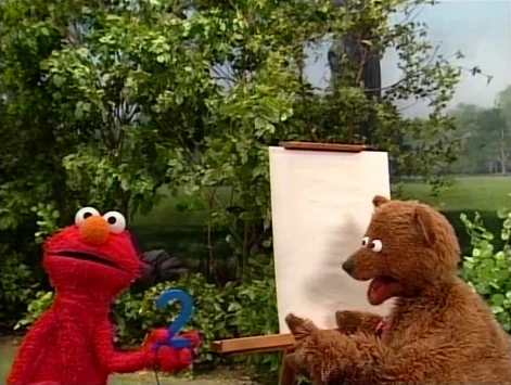 SCENE 2 | Elmo comes back with a number 2, which he wants to be seen holding in Baby Bear's picture. He asks for Baby Bear's input on what kind of pose he should make, which frustrates Baby Bear. Elmo finally decides on a pose, and just as Baby Bear is about to draw it, Elmo changes his mind again and runs off... |