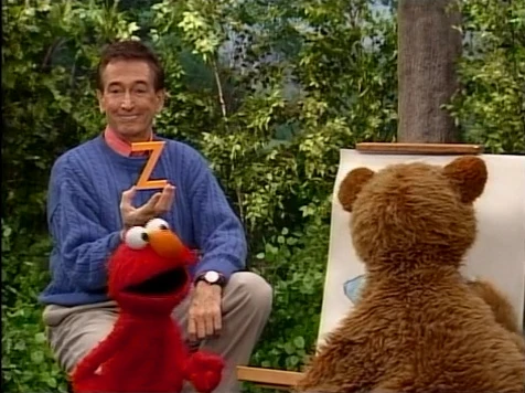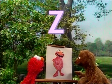 SCENE 1 | In the park, Elmo watches as Baby Bear draws a picture of Bob holding the letter Z ("Very heroic pose, Bob!"). Bob has to stay very still if Baby Bear wants to get the picture right. When it's finished, they all look at it and like it, and Baby Bear decides to give it to Bob to put on his refrigerator. |