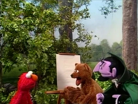 SCENE 3 | Elmo has decided not to hold anything in the picture, which relieves Baby Bear. He is about to draw when the Count comes along and asks to watch. Just then, Elmo notices Gina and the kids from her day care playing the "Three of These Things" game and has to join them. Baby Bear follows along, and before they leave the Count asks to borrow one of Baby Bear's crayons. |