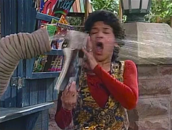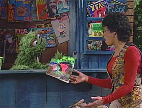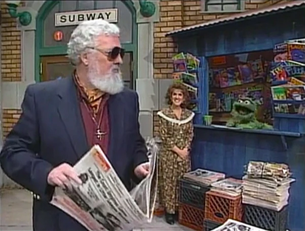 SCENE 4 | Oscar tells some nearby customers that there's no service on the A, B, C, D, E, or F trains when his mom comes flying out of the subway ("Now that's what I call an express!"). Oscar asks her what she's doing there, and she says she had to see personally that Oscar opened the newsstand. After confirming he's doing it to make people angry (for which she says she is very proud of him), Oscar shows her the "closed" sign he made which he then uses to fool a customer (Fran Brill in an onscreen cameo). His scheme backfires when the customer not only buys a newspaper anyway, but takes the sign as well. Oscar feels like a failure, but his mom cheers him up by reading a Grouch story from one of his magazines. |
