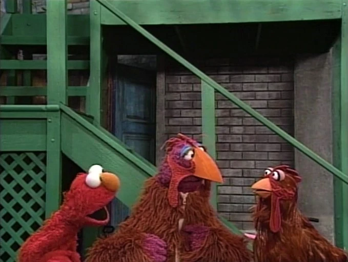 SCENE 1 | Telly finishes a joke to Elmo and Susan, who tries welcoming the viewer. She's interrupted by famed movie director, Walt Dizzy (though nobody has heard of him). He's on Sesame Street to find someone to play the titular role in his new "heartwarming, exciting, and money making" film, The Chicken King. Elmo recommends Telly and has him demonstrate his chicken acting skills, and Telly shows how he can cluck happily, sadly, and angrily. Walt is not impressed; he also needs someone who looks like a chicken. He continues his search while Elmo decides to help Telly by making him look the part, asking an unamused passing chicken (Jerry Nelson) for their feathers. |