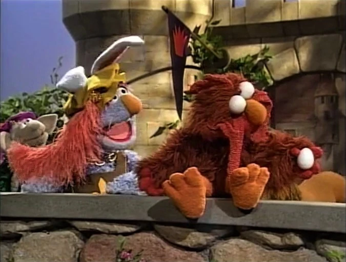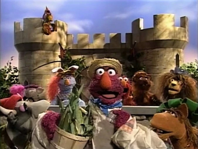 SCENE 5 cont'd | In the film, a squire rabbit (David Rudman) addresses the kingdom of fellow animals. The time has come to choose a king from among the population, but it must be someone who can turn an ear of corn into an egg. A cocksure lion (Nelson) gives it a try, but only growls and roars at the corn. Elmo Chicken passes through, wishing to also try. The lion doesn't think he can do it, but Elmo eats up the ear of corn, giving him the energy to lay an egg. They declare him king and wish for more eggs to eat. Telly appears at the end, nervously playing a farmer who provides the kingdom with more corn. |