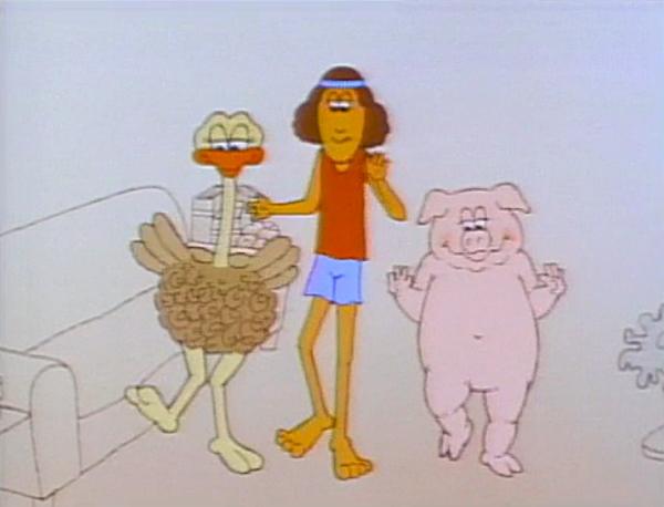 Cartoon | An ostrich, a girl, and a pig do some exercises, and move the couch away. (First: Episode 2988) |