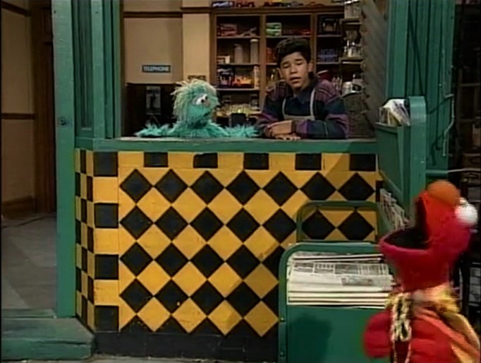 SCENE 2 | Running Elmo runs past Hooper's Store, noticed by Rosita and Carlo. Rosita asks questions to find out what Elmo's doing and this encourages her to join him, calling herself "Running Rosita." |