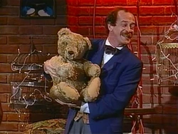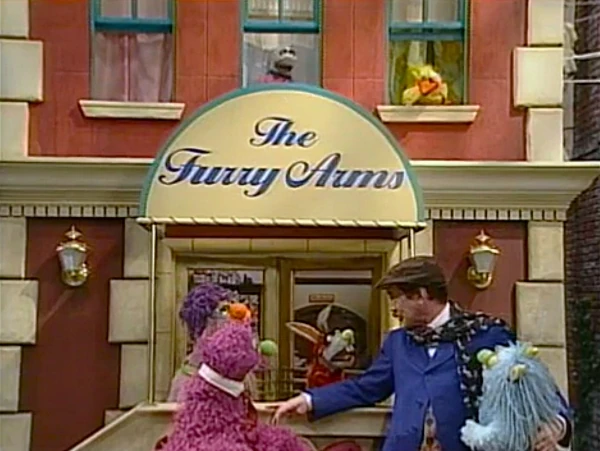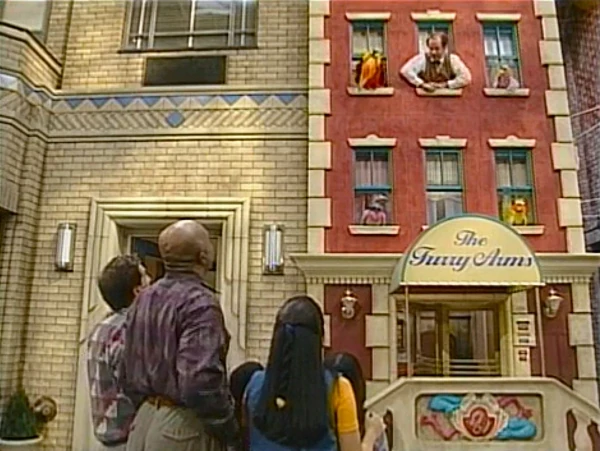 SCENE 3 | Bob, Gordon, Celina, and the kids gather outside the Furry Arms and call up to Mr. Tweeter at his window, assuring him that they are all working together to find his suitcase. The Amazing Mumford returns having heard the news, and now that he is rested, he solves the problem by making the suitcase reappear. Mr. Tweeter thanks him and is very happy he'll be able to perform tonight... that is, if he can get himself unstuck from his window. |