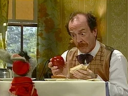 SCENE 2 | Mr. Tweeter tries to get some rest on his Muppet-sized bed in his Muppet-sized hotel room when Benny brings a sandwich, an apple, and a glass of milk to him. He doesn’t want it, but Benny makes him eat it since he needs his strength for the evening’s performance. Mr. Tweeter eats some and finds that he's feeling a little better, but breaks down sobbing again when he gets a phone call saying his suitcase still hasn't been found. |