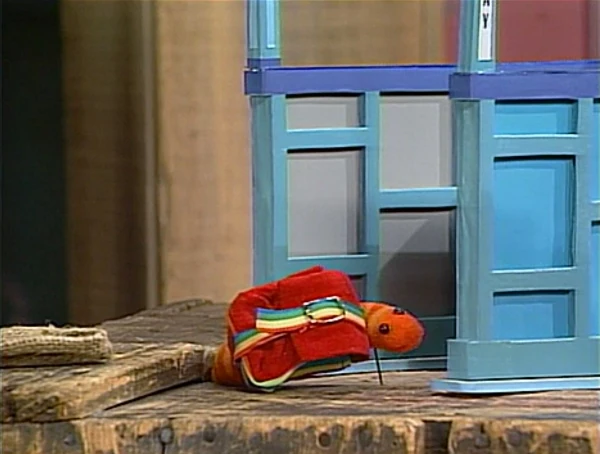 SCENE 5 | Slimey returns from the Worm Subway, done with his errands and wearing a full knapsack. Maria goes through the knapsack and finds cereal, laundry, a sneaker, and some books. Slimey is upset with Maria again for emptying his knapsack, until Maria finds his errand list. It reminds him that he forgot to get a birthday card for his Aunt Soila, so he forgives Maria. Slimey leaves as Maria looks after his stuff and announces the sponsors. |