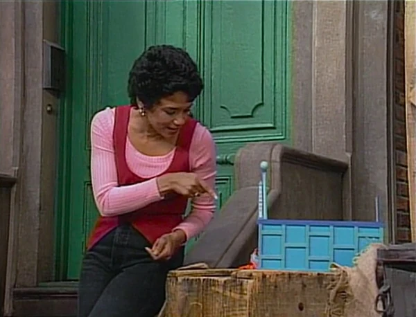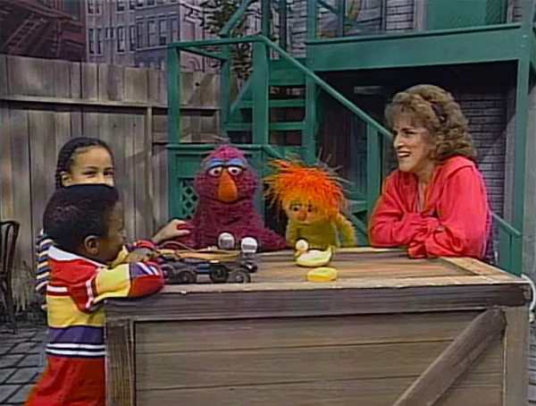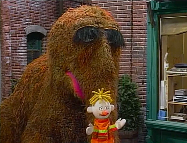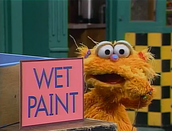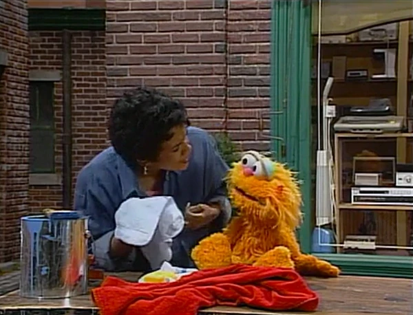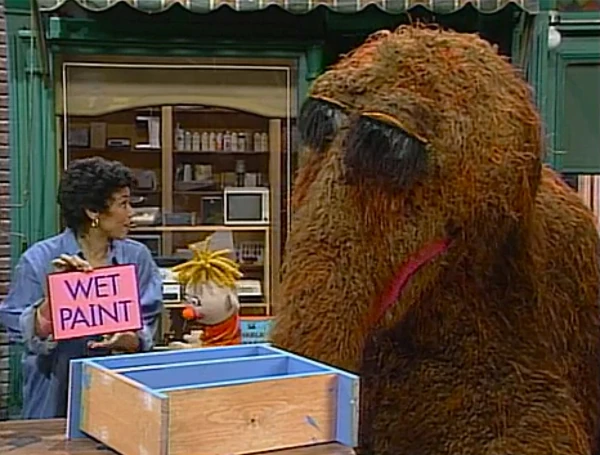 SCENE 2 | Snuffy (as his snuffle-puppet Gus) begs Maria to let Gus warn others about Maria's bookcase with wet paint, even though she has a sign that does so. Maria relents and goes into the Fix-It Shop to work. Zoe comes by and is thrilled to meet Snuffy's puppet (calling him a "pupple on his snuffet"), laughing so much that she ends up bumping into the bookcase and getting blue paint on her nose. |