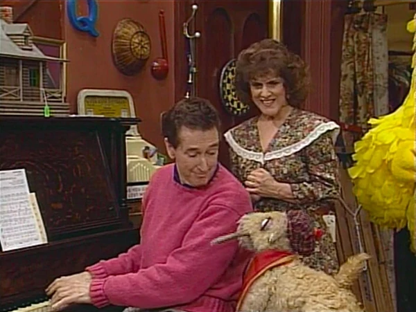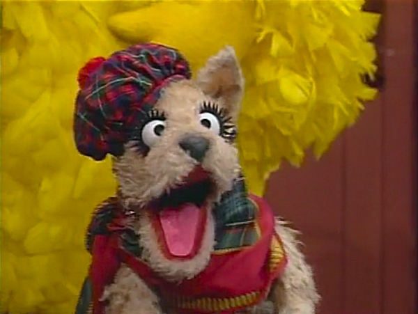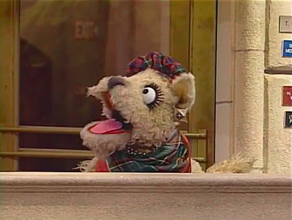 SCENE 1 | Big Bird spots a cute little Scottish terrier by the Furry Arms Hotel. He goes over to investigate, but the terrier resents being treated like a little puppy. After all, she's Renata Scotty, the world-renowned dog opera singer! She explains what operas are - stories set to opera music. She's sung works by canine greats such as Poochini, Waggner, and Johanne Sebastian Bark. She's come to Sesame Street to look for something she desperately needs. It reminds her of an aria from La Bone-em, which she sings for Big Bird. She says her singing would sound better if she had a piano player to accompany her, preferrably one who knows all kinds of music and likes dogs. Big Bird wonders, "Who do I know like that?" |