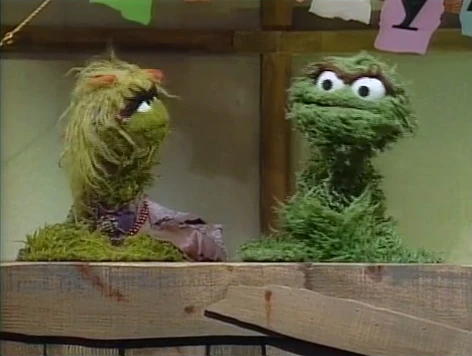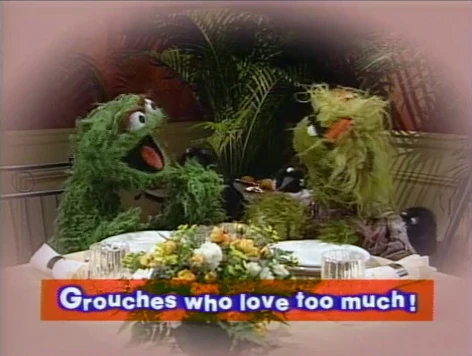 SCENE 1 | Sally announces that today's guests are two Grouches, one of whom fell in love with the other. Oscar admits that it was him and begins to tell the story of how it happened, seen in a flashback. This morning he and Grundgetta were having their usual morning argument. "Suddenly, I started hearing this yucky, sweet violin music," Oscar continues. "And then my heart was going pitty-pat, pitty-pat... I couldn't even nyah-nyah-nyah-nyah-nyeahhh..." Grundgetta couldn't stand Oscar looking at her with "gaga eyes," but the worst part is when Oscar suddenly blurts out, "Grundgetta, I... I love you!" |