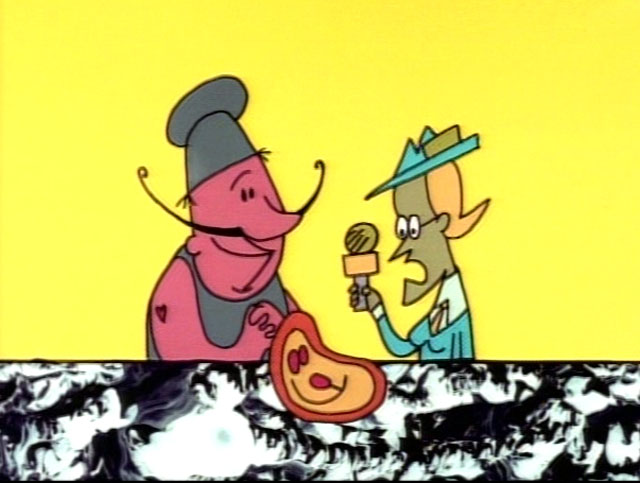 SCENE 4 | Oscar and Grundgetta continue arguing when all of a sudden, Grundgetta hears pretty violin music, her heart goes pitty-pat pitty-pat pitty pat, and she doesn't feel like arguing; she becomes attracted to Oscar! She tells Oscar to kiss her, which Sally is against ("On my show? What are ya tryin to do, raise my ratings?") but Oscar reluctantly does so. Grundgetta returns to normal and gets angry at Oscar for kissing her. They continue arguing as usual while Sally announces the sponsors and signs off. |