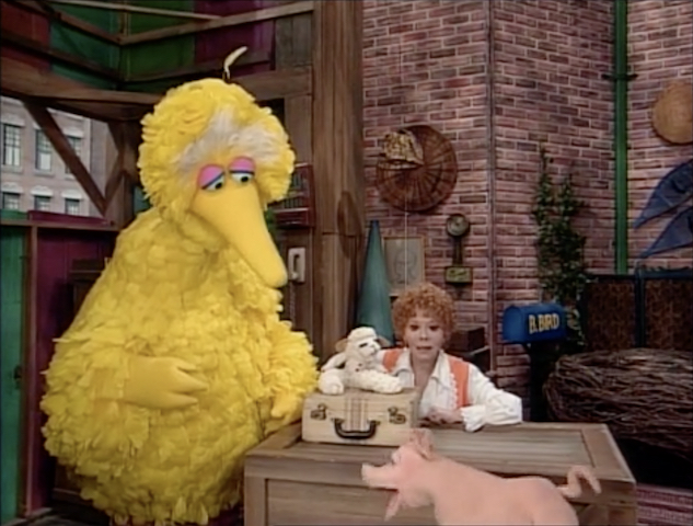 SCENE 2 | The trio has learned that the pig is named Sooey, and she believes nobody would like to be friends with her because she's a pig. She says the only things she knows how to do is oink and roll around in mud. Shari compliments her on both things, but then they find out Sooey doesn't know the alphabet. They teach it to her by saying it twice, which makes her feel proud. She is especially impressed by Big Bird's teaching ability, getting an idea on how to get people to like her. She trots away, leaving the others intrigued... |