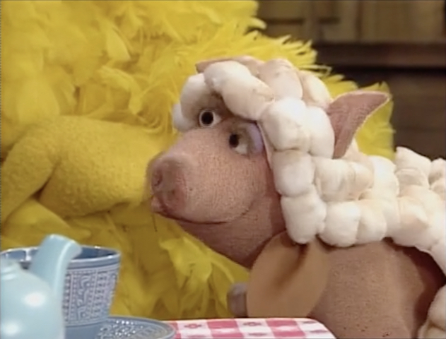 SCENE 4 | Sooey has come back dressed as a lamb this time. She thinks everyone will like her the way they like Lamb Chop, but Lamb Chop only laughs at this attempt. Big Bird makes it clear that she can't be another animal by dressing like one, and Sooey bursts into tears. In song, they show her that they already love her the way she is - she's "Perfect as a Pig." When it's over, Sooey runs off inspired yet again. |