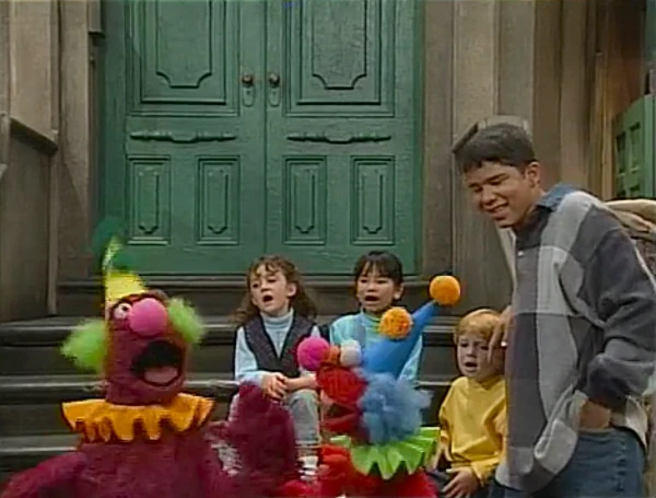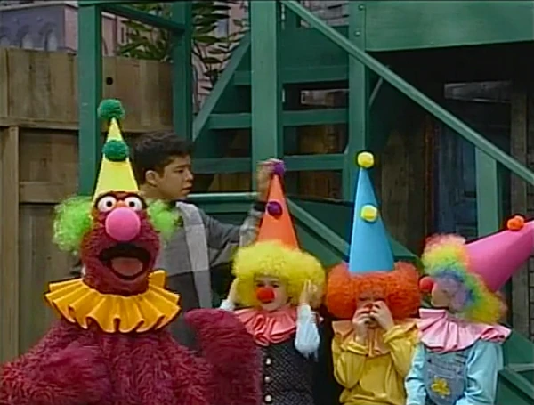 SCENE 1 | Telly, Lexine, Brett, and Melissa are all dressed as Kuku the Clown, whom Telly saw at the circus. He shows Carlo the funny way Kuku would wave his arms and go "Kuku! Kuku!" and offers him a leftover clown outfit his mother made, but Carlo declines. Elmo comes over looking for Telly, but at first glance of a clown, he runs off screaming. |