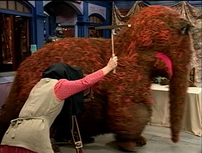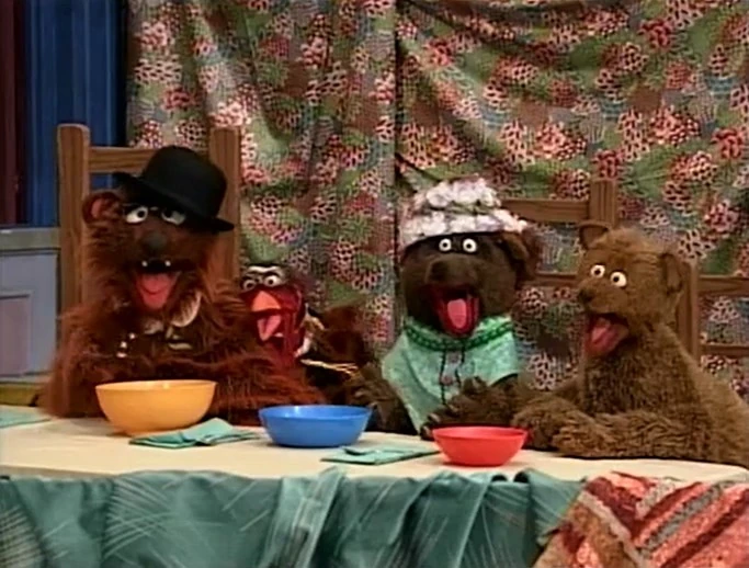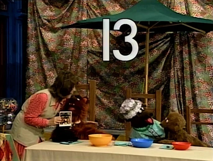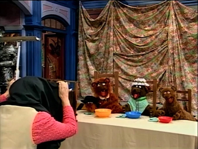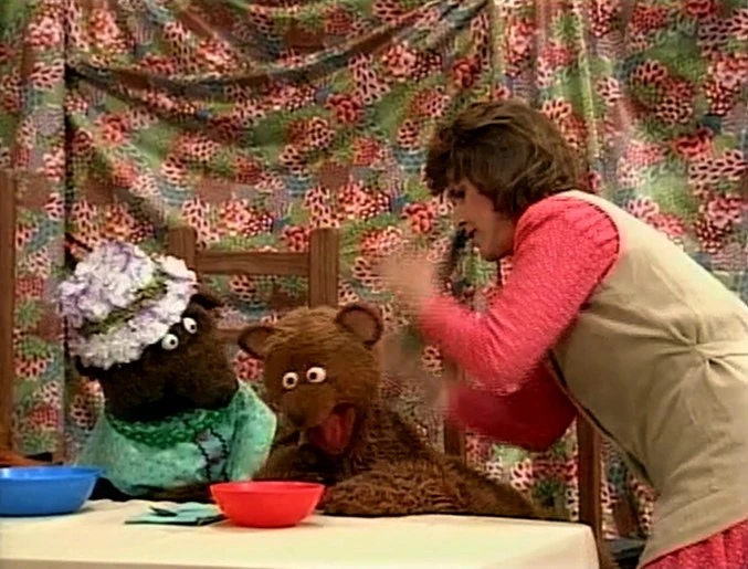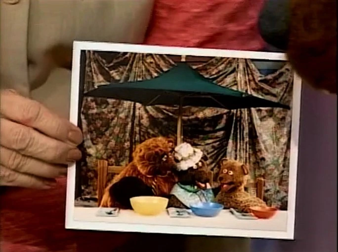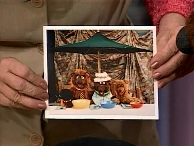 SCENE 6 | Baby Bear has produced a "Do Not Blink" sign to keep himself from doing so. Despite this and the other precautions they have, he's certain something will ruin this photo. Sure enough, just as Ruthie is about to snap it, a fire engine siren goes off and Baby Bear can't take it anymore. He throws a fit until his parents comfort him, reassuring him the fire engine is nowhere in the shot. Ruthie snaps a photo of the moment, and the Bear family finds it's a new perfect family photo for all of them to carry copies of. They share some hugs with Ruthie as Snuffy announces the sponsors, ending with a freeze frame of the new family portrait. |